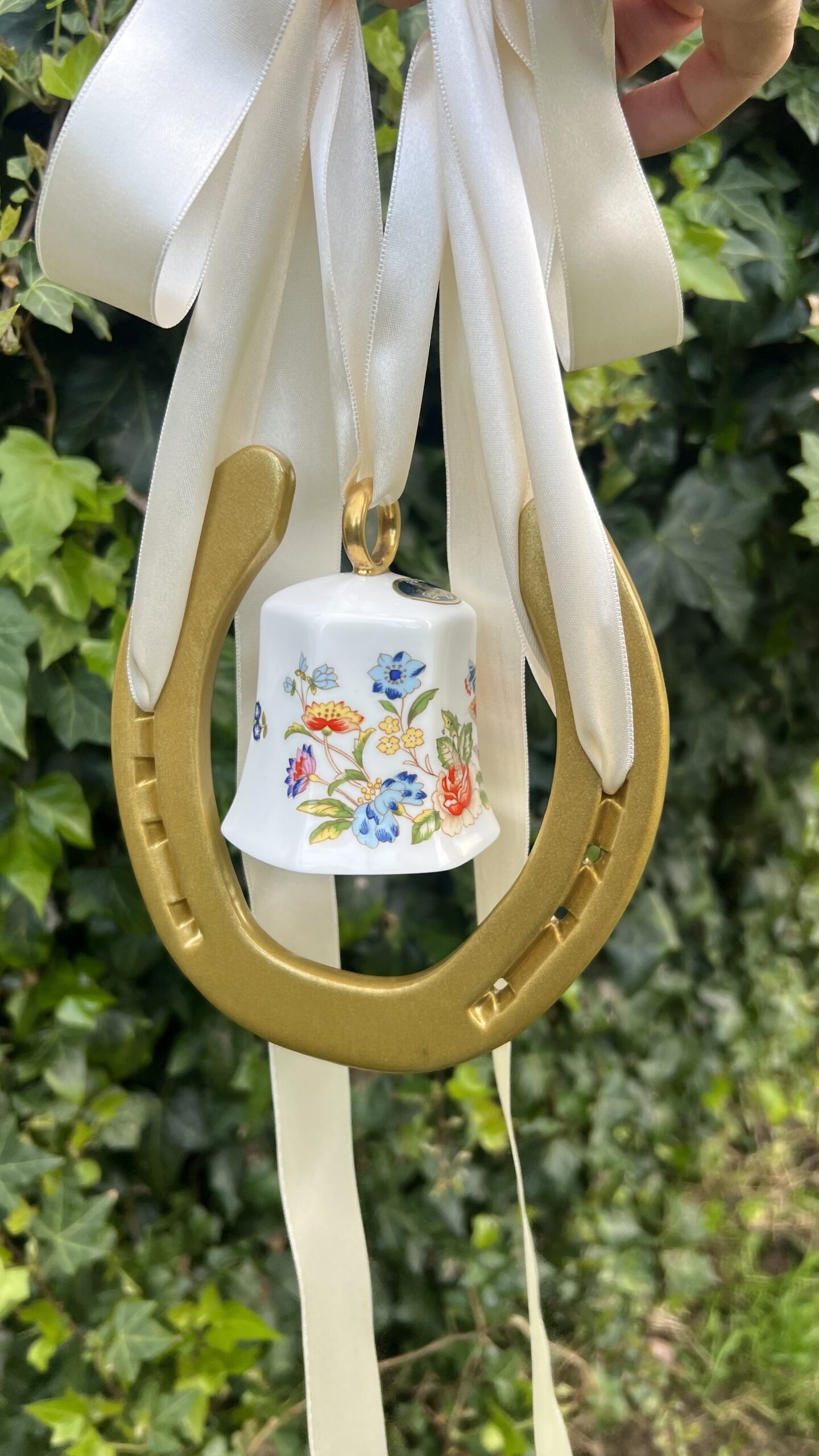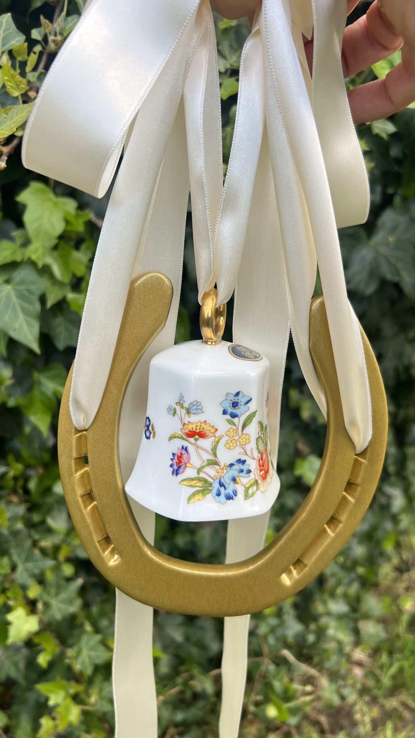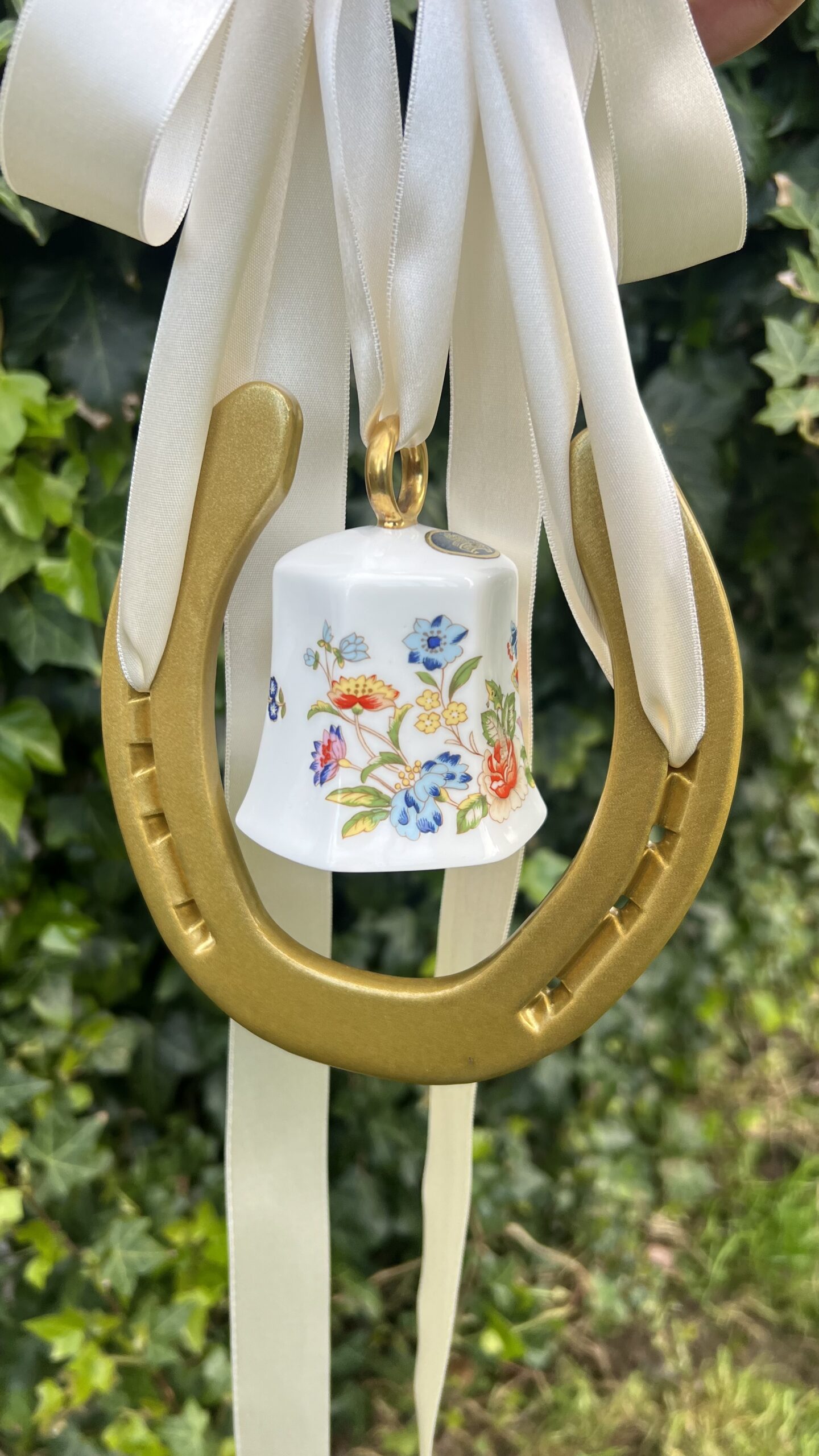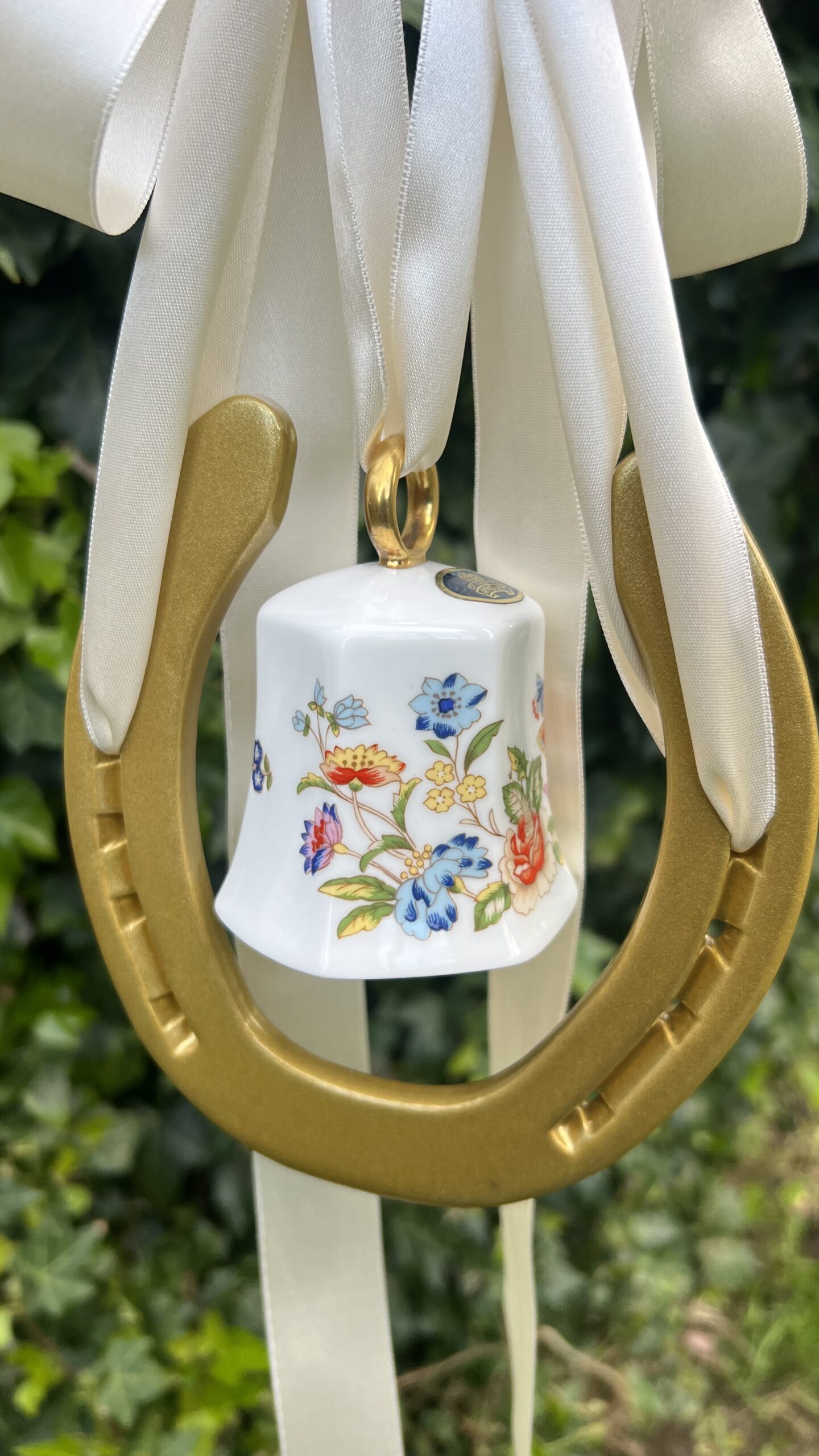 This fab piece .. a genuine horse shoe once worn by an irish sports horse and we have added a genuine very distinctive Ainsley China Bell.