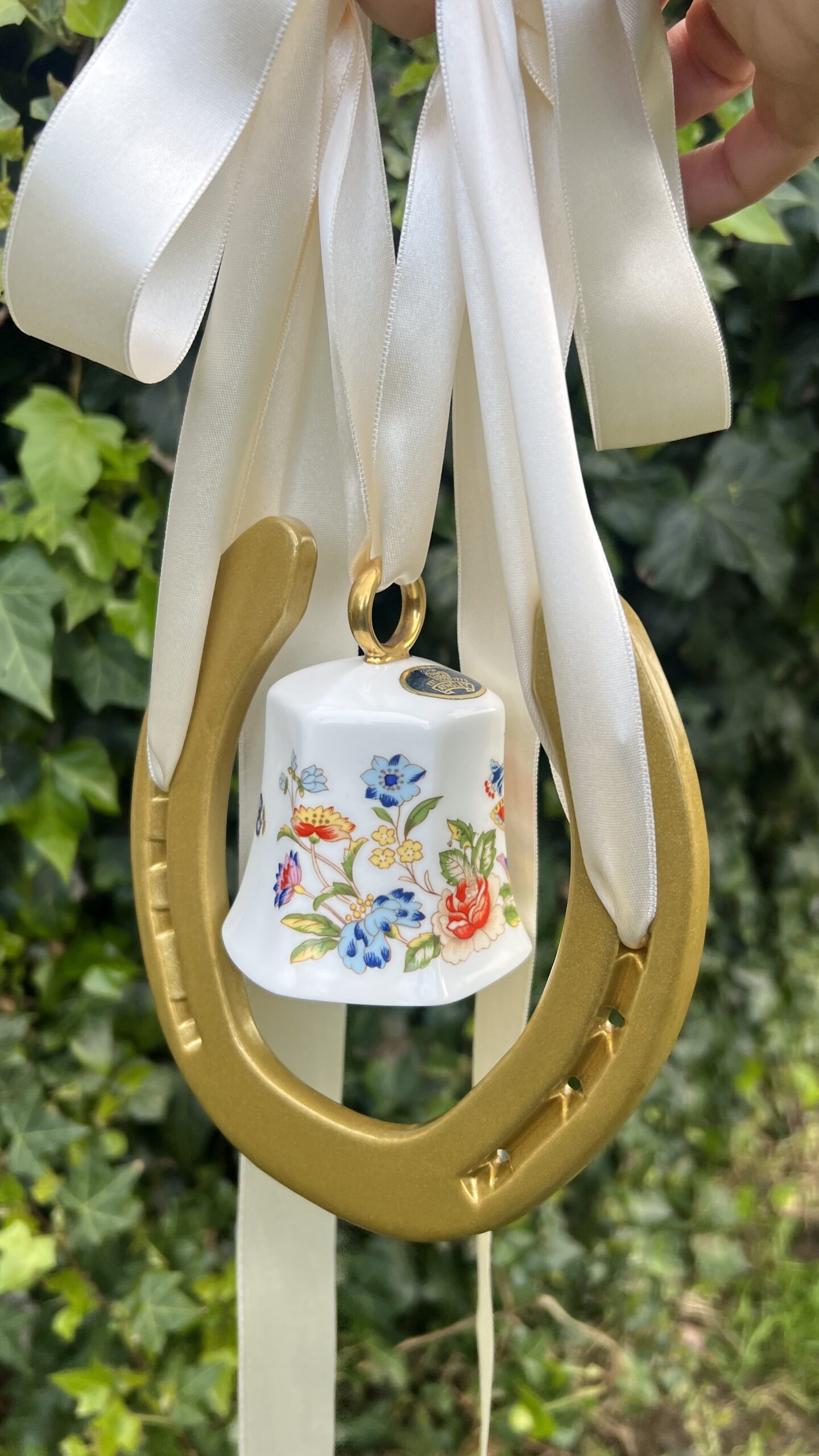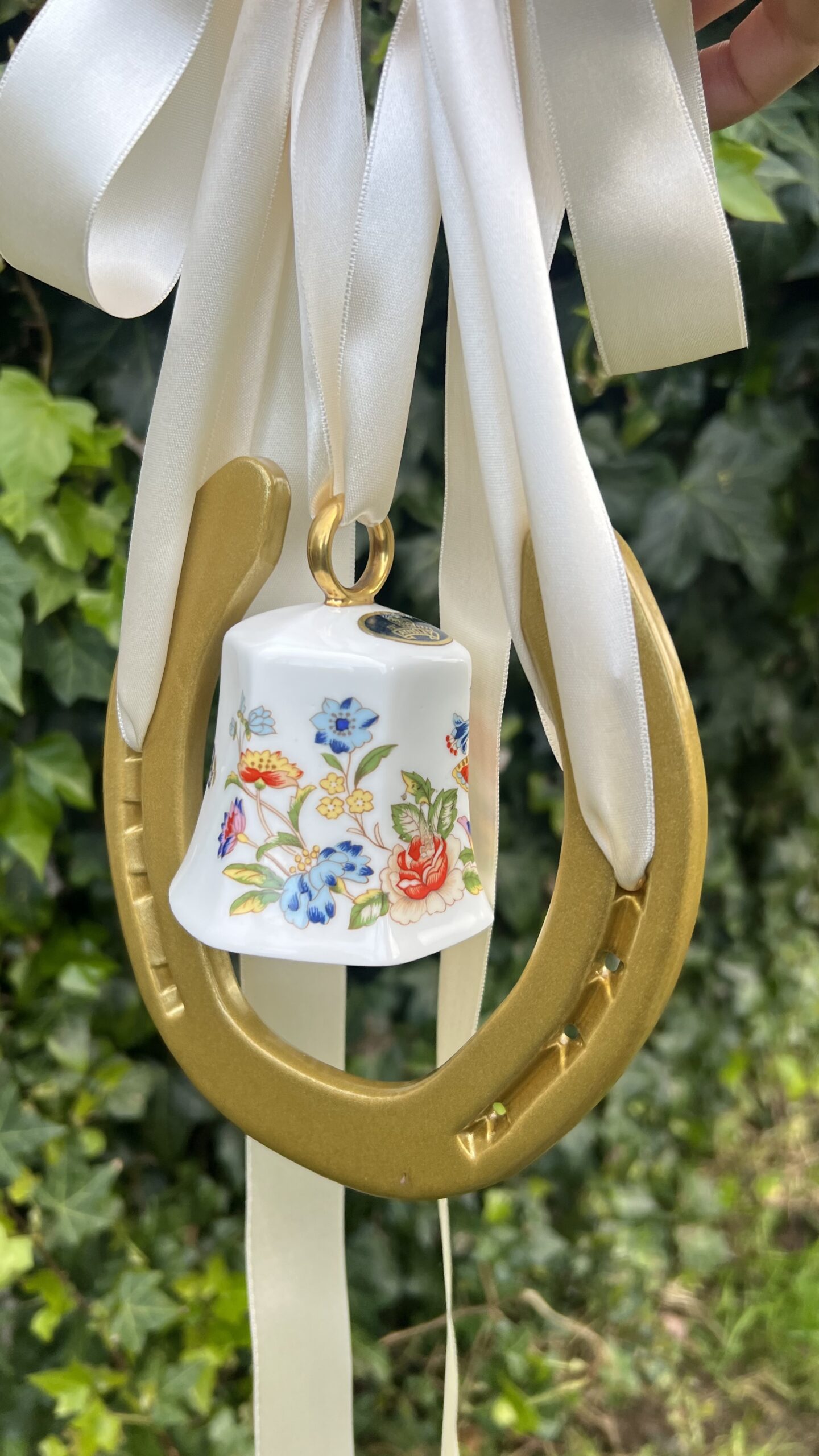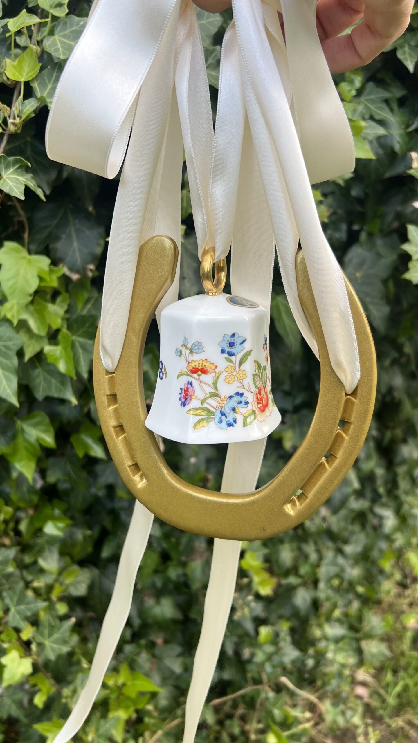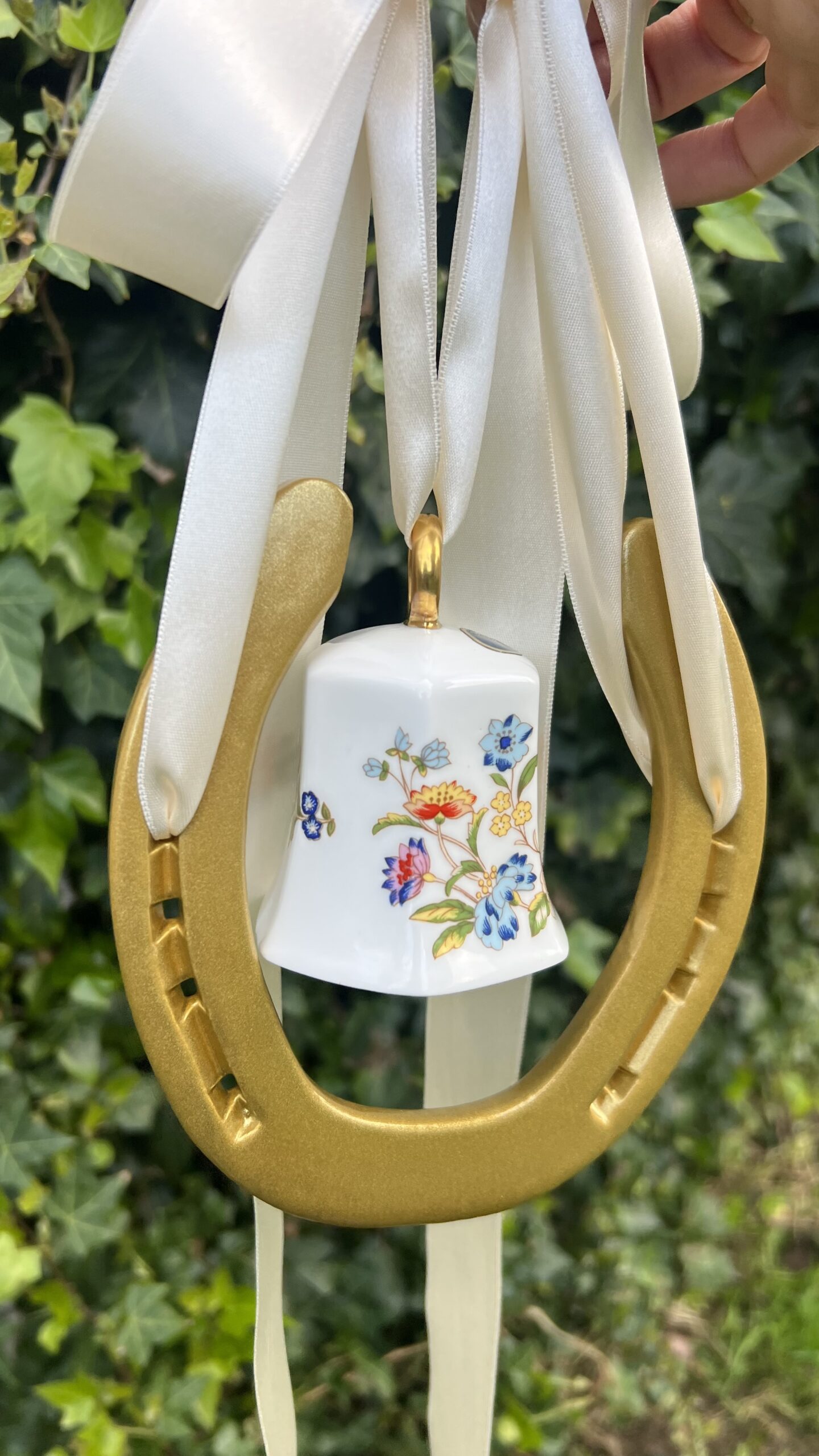 This fab piece .. a genuine horse shoe once worn by an irish sports horse and we have added a genuine very distinctive Ainsley China Bell.